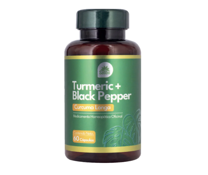 Turmeric + Black Pepper Satibo — suplemento dietario formulado con extractos de cúrcuma (Curcuma Longa) y pimienta negra, diseñado para apoyar la salud articular, la respuesta inflamatoria y el bienestar digestivo. Presentación: frasco de 60 cápsulas.
